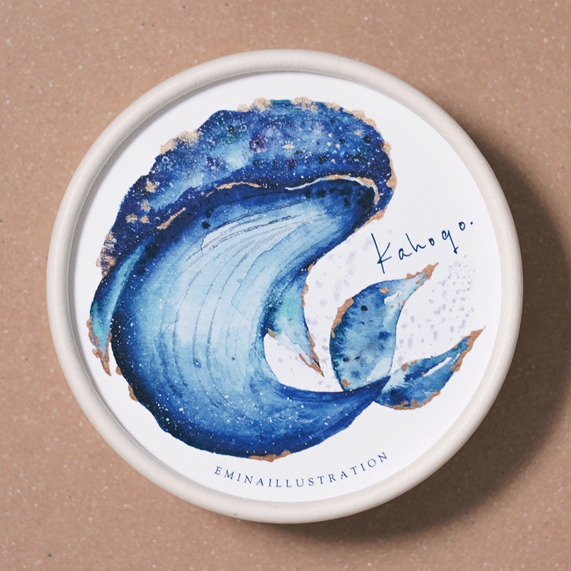 大切に大切に作られた、地球に優しい手作り透明石鹸のKahogo soapでくじらの体を洗ってみるとどうなるだろう。そんなストーリーを想像をしながら描いた「まるくじら」です。爽やかでキラキラしていて、透明感のあるとっても気持ちが良くてとろけそうなくじらを表現しました。