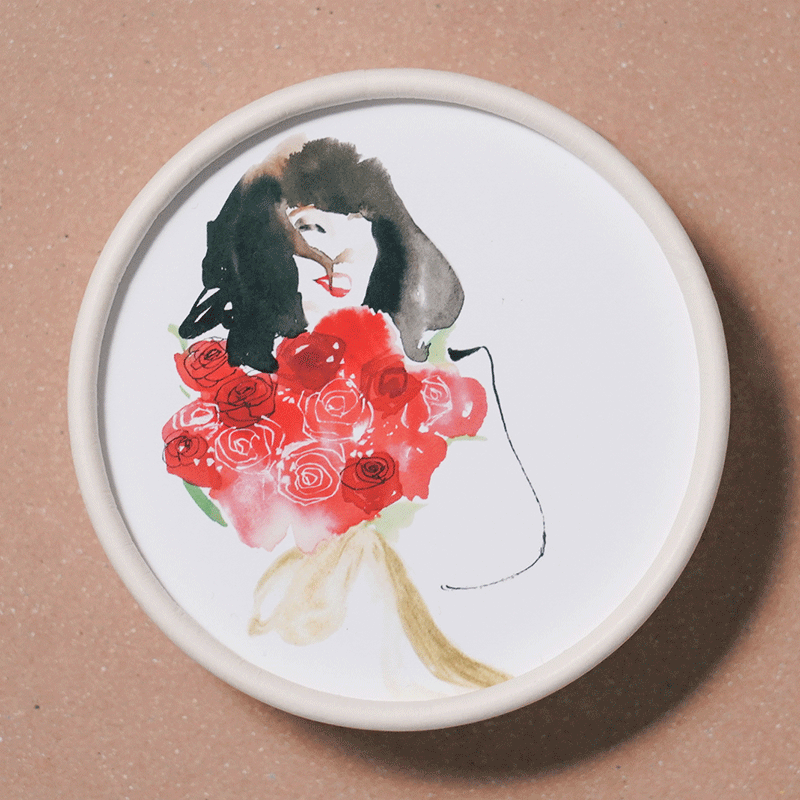 kahogo soapを使われた方が思わず笑顔になる様子をイメージしながら、花束を持った笑顔の女性を描きました。日常に笑顔になる瞬間がたくさんあれば良いなという思いも込めています。