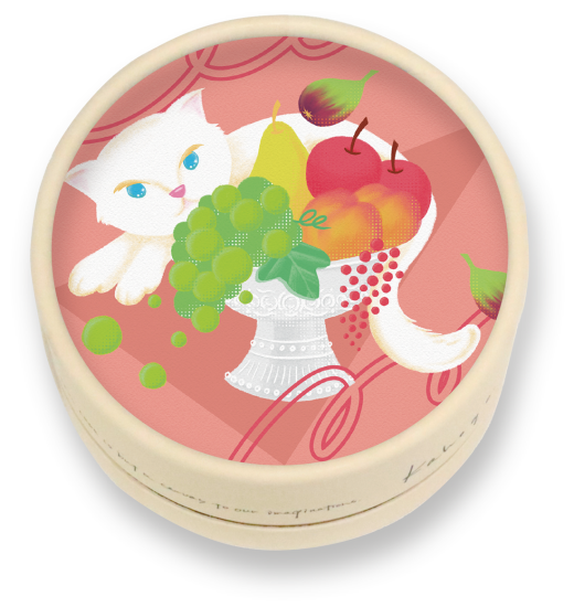 白い子猫がたくさんのフルーツと一緒に幸せそうに横になっている様子を描きました。いたずらっぽい猫ちゃんの表情と動きのあるフルーツがポイントになっています。いつも動植物をテーマに描いおり、この作品は近所の地域猫さんをモデルにしました。何気ない日常の中で、動物が見せる愛らしさやユニークな仕草を感じ取っていただけたら嬉しいです。