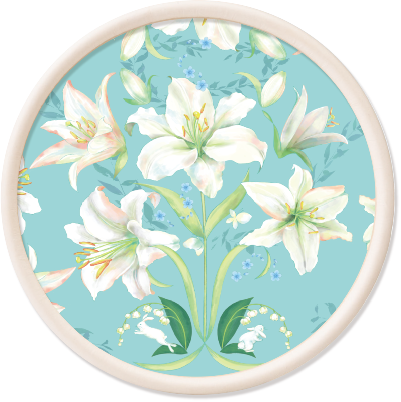 百合の中でもひときわ大きく優美で清楚なカサブランカと、風に舞うブルースター、ぴょっこり香りに誘われた白うさぎ。